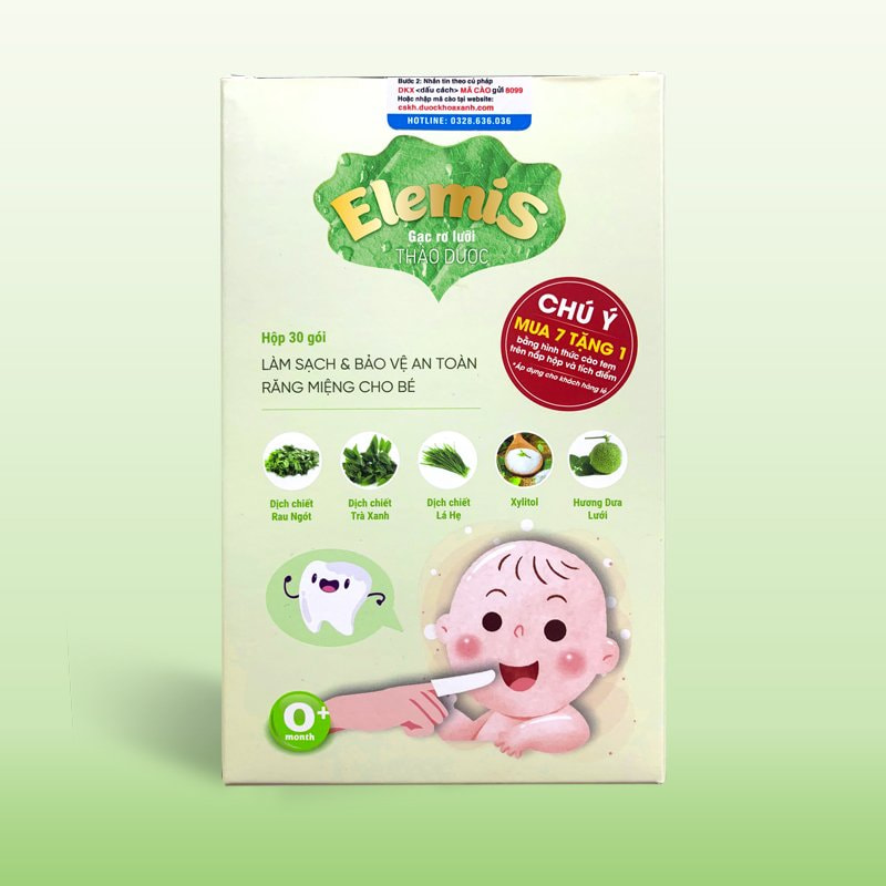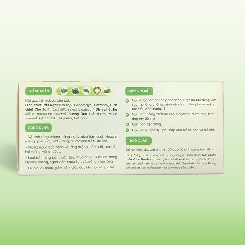 Mỗi gạc mềm được tẩm bởi: Dịch chiết rau ngót, Dịch chiết chè xanh, Dịch chiết hẹ, Hương dưa lưới, Xylitol, NaCl, NaHCO3.