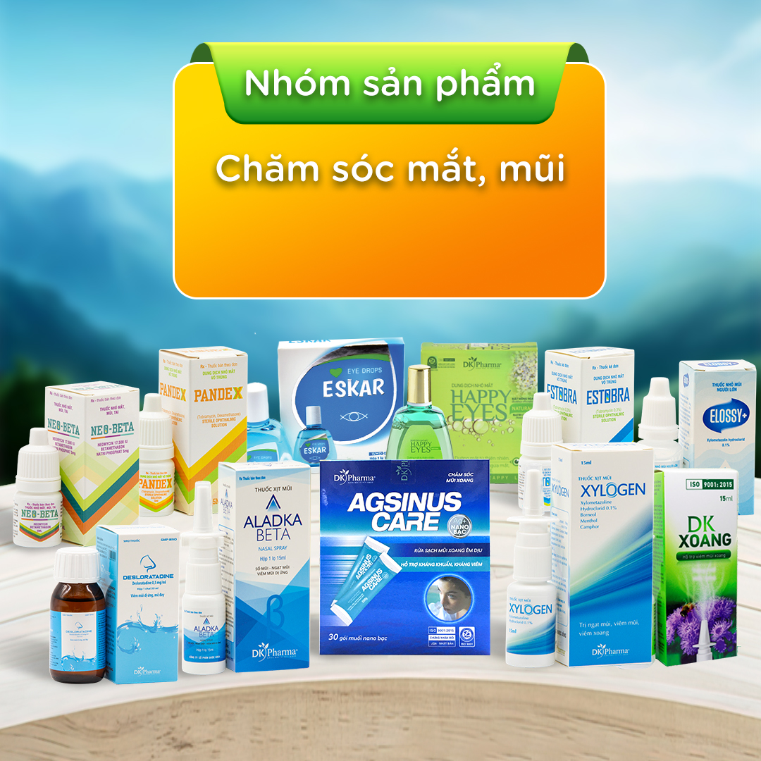 - Nhóm sản phẩm chăm sóc mắt, mũi: Dung dịch nhỏ mắt Happy Eyes Natural, Thuốc nhỏ mắt Eskar, Thuốc nhỏ mắt mũi tai Neo Beta, Thuốc nhỏ mắt Pandex, Thuốc nhỏ mũi Elossy+, thuốc xịt mũi Xylogen, thuốc xịt mũi Aladka Beta, thuốc nhỏ mắt vô trùng Estobra, Thuốc trị viêm mũi Desloratadine, Muối Nano Bạc chăm sóc mũi xoang Agsinus Care, Xịt mũi DK Xoang.