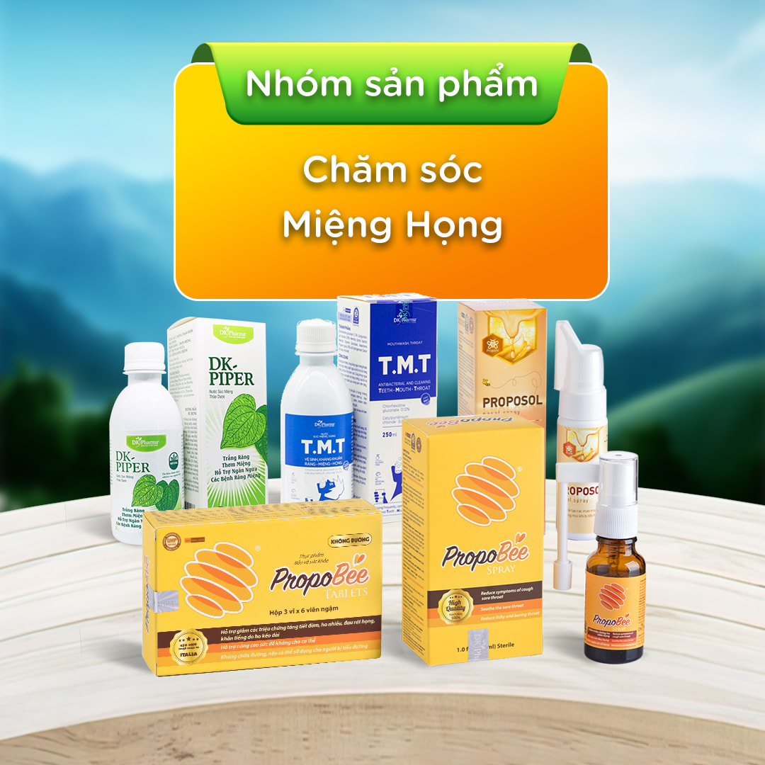 - Nhóm sản phẩm chăm sóc miệng, họng: Dung dịch rửa mũi keo ong Proposol, Xịt họng giảm ho keo ong Propobee Spray, Viên ngậm giảm ho Propobee Tablets, Dung dịch súc miệng T.M.T, Nước súc miệng thảo dược DK Piper.