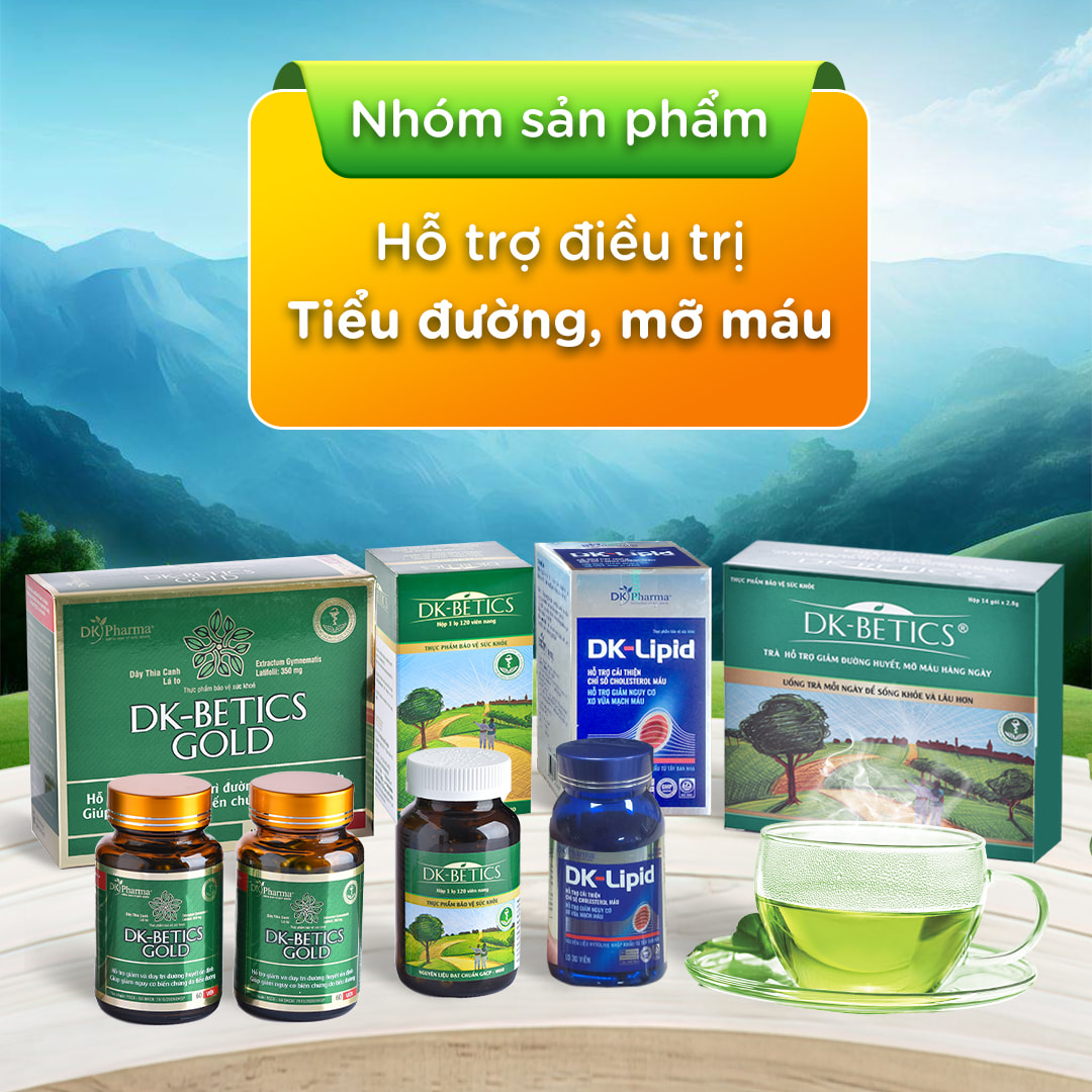 - Nhóm sản phẩm hỗ trợ trị tiểu đường, mỡ máu: Viên uống tiểu đường DK Betics, Viên uống tiểu đường DK Betics GOLD, Trà túi lọc dây thìa canh DK Betics, Viên uống hỗ trợ mỡ máu DK Lipid.