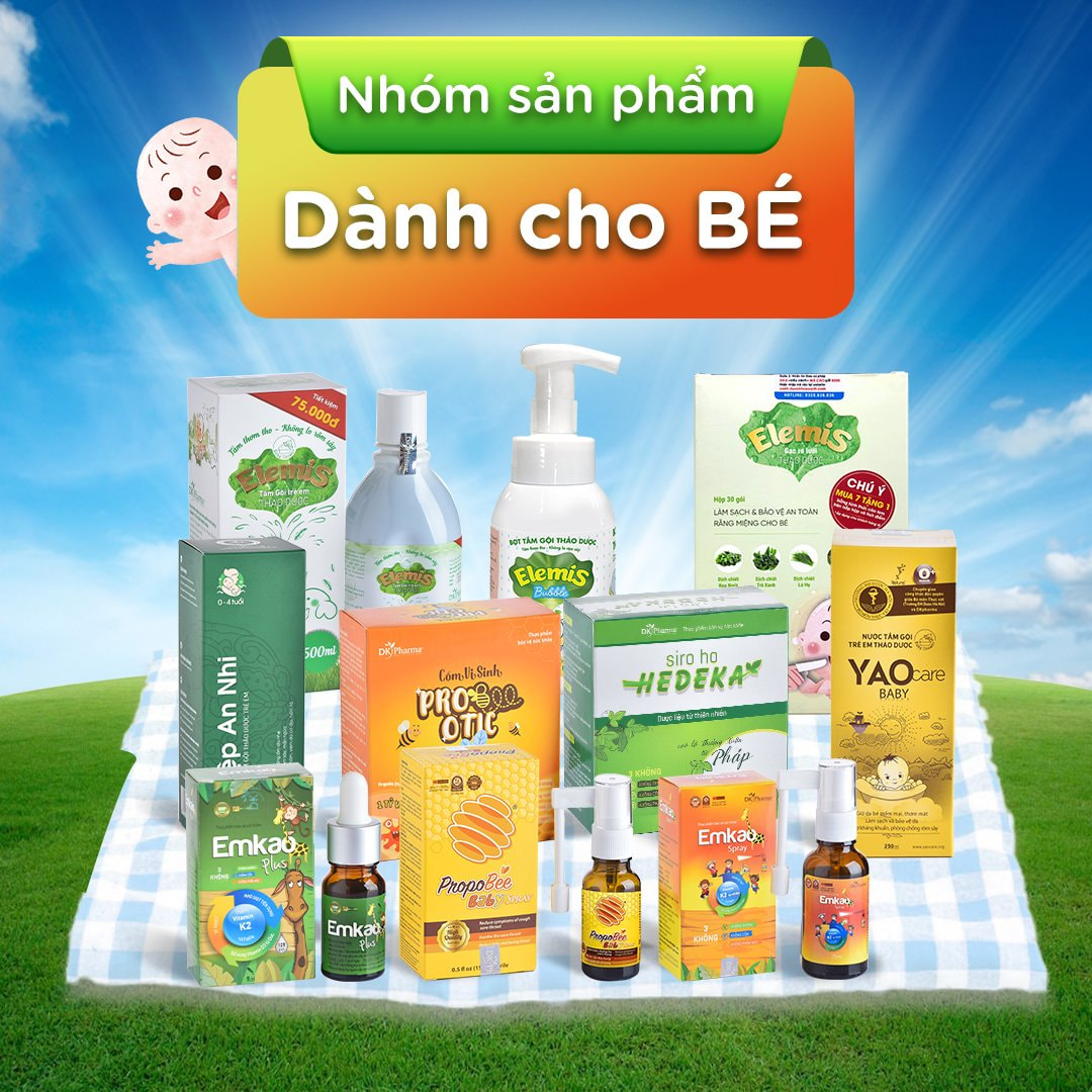 - Nhóm sản phẩm dành cho Bé: Nước tắm thảo dược Elemis, Bọt tắm gội thảo dược Elemis Bubble, Nước tắm YAOcare Baby, Gạc rơ lưỡi Elemis, Nước tắm gội Diệp An Nhi, Xịt muỗi Diệp An Nhi, Vitamin Emkao Plus, Vitamin Emkao Spray, Cốm Vi Sinh Probeeotic, Siro ho Hedeka, Xịt họng ho Propobee Baby Spray, Xịt mũi Proposol Baby.